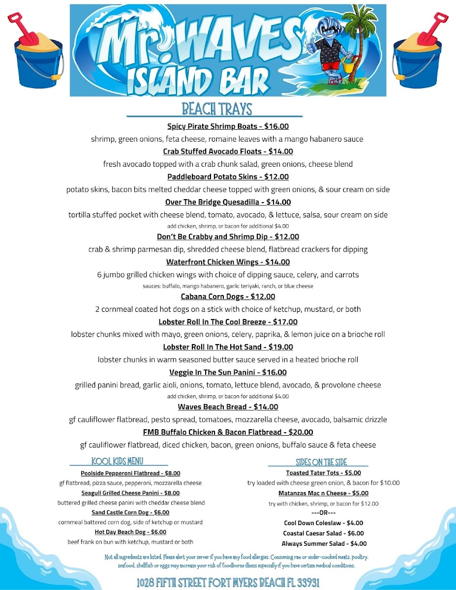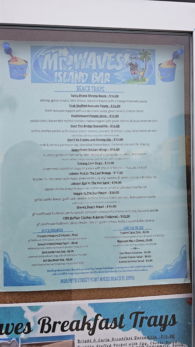Welcome to Mr. Waves Island Bar, nestled in the heart of Fort Myers Beach, Florida. This vibrant spot offers a diverse menu that caters to all tastes, from breakfast to dinner, making it a perfect stop for any meal of the day. Start your morning with favorites like Tenders and Waffles or a hearty Breakfast Quesadilla. For lunch and dinner, indulge in options like deliciously crispy Corn Dogs or fresh salads topped with your choice of proteins.